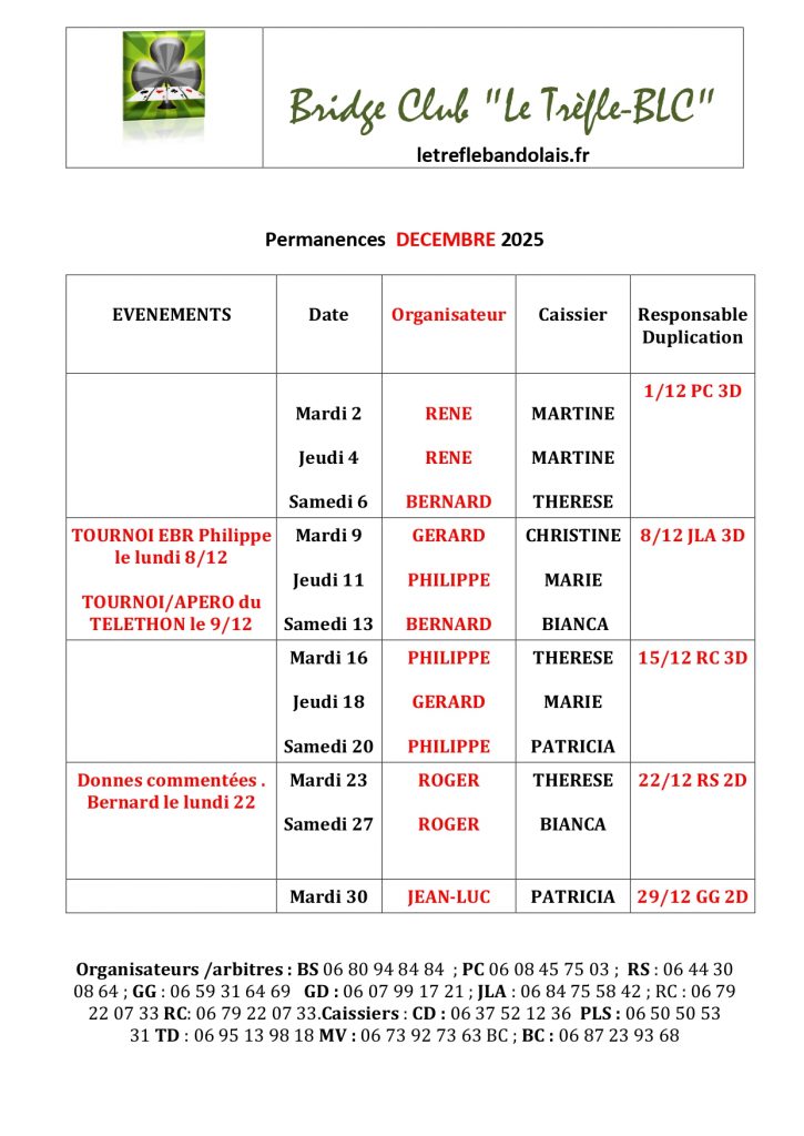 – Mardi 14h : tournoi de Régularité, ou simultané. En moyenne 16 tables.